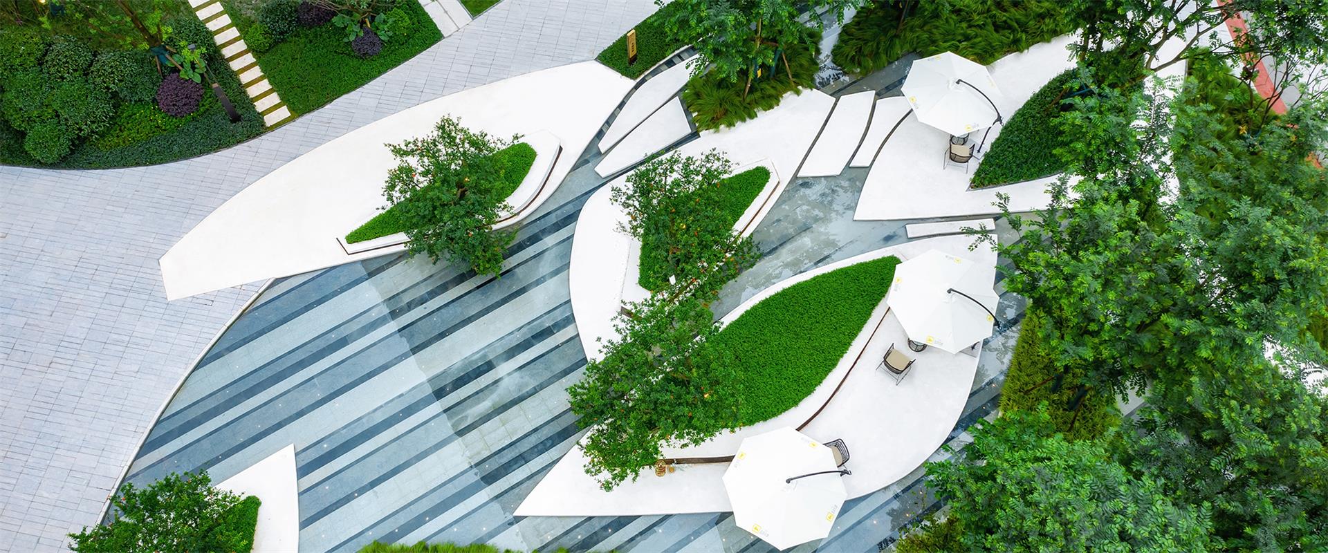 万科高端产品“翡翠系”的标杆之作。项目以都会极简风为主题,园林绿化配合精练优雅的设计主旨,以不规则几何线条围合出植物组团和休憩空间,石材以高级灰、米白为主色调,辅以现代派立体雕塑、小品、镜面水景,予人以“翡翠”的清莹、剔透和冷峻的未来感,是为高端精英人士打造出的国际化高品质生涯空间。