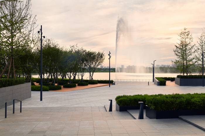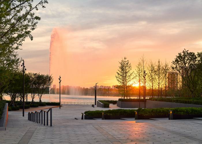 项目位于四川省国家级新区----天府新区,依托怡心湖绝佳的自然资源,将“花园都会”的精髓浓缩于这湖滨景观之中。玄色花岗岩打造的叠水景,水体沿阶面层层而下,泛起出级级跌落的形态。极具现代主义的怡心湖公园,漫天的银杏树,以“展示时间变换的盒子”为设计看法,使银杏广场展现出四序更迭,一季景物,一季回忆的时光之美。景物绮丽的环湖步行绿道,美妙绝伦的百米湖心喷泉,波光潋滟的辽阔湖面,勾勒出一幅奇异的浪漫画卷。都会与公园的融合,让怡心湖意味深长,绿意盎然的湖滨景观,在都会之中、喧嚣之外营造了一个理想的生态绿洲,成为住民恬静生涯的绝佳休闲区。