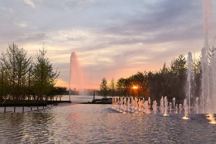 玄色花岗岩打造的叠水景,水体沿阶面层层而下,泛起出级级跌落的形态。极具现代主义的怡心湖公园,漫天的银杏树,以“展示时间变换的盒子”为设计看法,使银杏广场展现出四序更迭,一季景物,一季回忆的时光之美。景物绮丽的环湖步行绿道,美妙绝伦的百米湖心喷泉,波光潋滟的辽阔湖面,勾勒出一幅奇异的浪漫画卷。