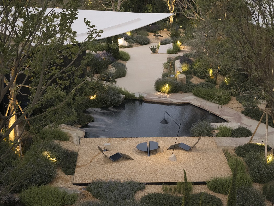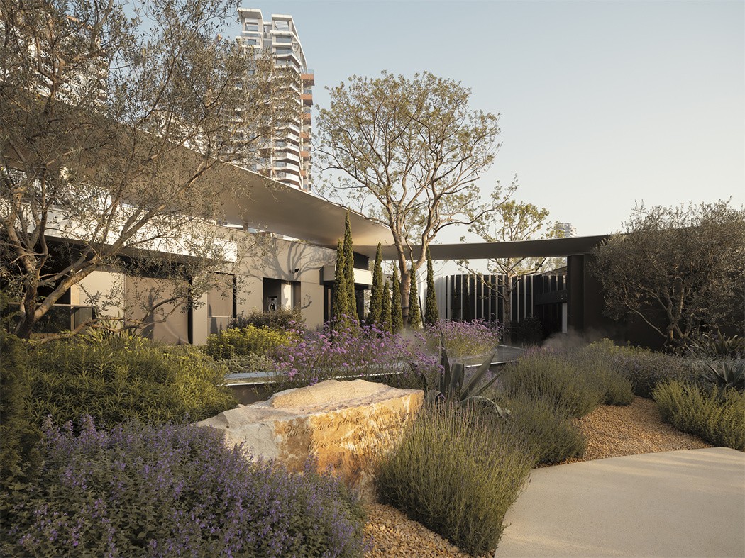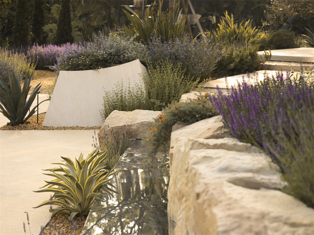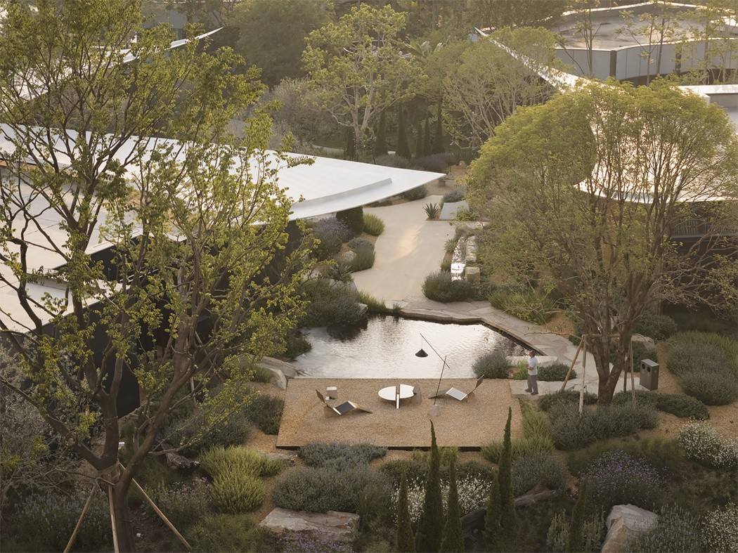 同时通过奇异的植物设置,选用铁冬青、油橄榄、龙柏、菲油果等多莳植物,构建南法地中海风情植被系统,营造出浪漫、松懈的气氛;在色彩和条理搭配方面,通过薰衣草紫与柏坡黄、灼烁蓝蓟与鹦鹉嘴百脉根等补色穿插运用,以及龙舌兰与墨西哥飞蓬等对画面饱和度的调理,团结龙柏、澳洲米花等对明暗色调的处置惩罚,形成色彩协调、主次明确的植物景观。