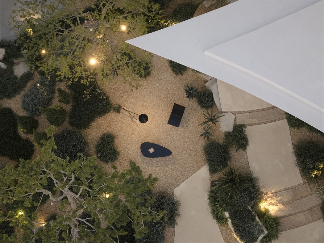 通过接纳“天涯花环”设计——以桁架为整体结构,上部块面接纳镜面表皮,将花境植被的生气延伸至半空,似乎将自然之美托举向天涯;下部则以翻转形态形成二次反射,消弭了桁架柱梁的厚重感,使其如悬浮于修建之上的艺术精灵,灵动而富有张力。