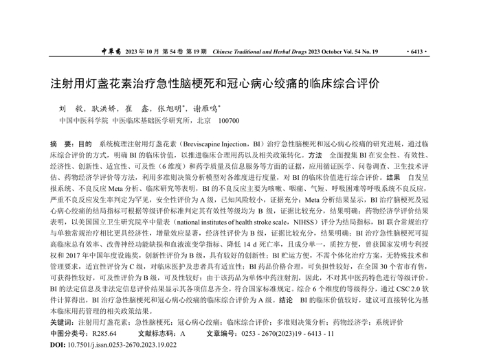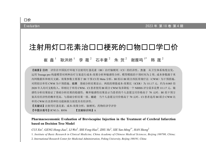 问题:注射用灯盏花素治疗脑梗死的药物经济学评价崔鑫1耿洪娇1李薇2石丰豪2朱贺2谢雁鸣1*韩晟21.中国中医科学院中医临床基础医学研究所,北京100700;2.北京大学医药管理国际研究中心,北京100191